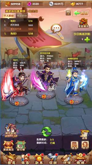 演武场开启后,系统会自动刷新3名玩家作为你的敌人,玩家可以选择任意一名敌人进行挑战。挑战敌人胜利,可以获得积分(用于演武场排名)和武魂(可在演武场商店中购买商品),同时对手扣除一定的积分;挑战敌人失败,可以获得部分武魂;挑战积分越高的对手,获得的积分越多。战胜一个对手后,系统自动刷新3名敌人,若遇到无法战胜的对手,可以手动消耗刷新次数刷新。每天有10次挑战次数。演武场中有情侣助战系统。点击情侣助战,玩家的情侣会替代玩家去挑战对手,且不消耗挑战次数。