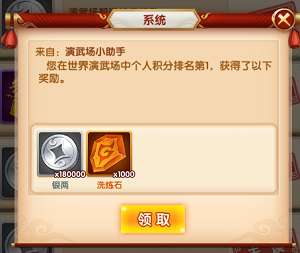 首次进入演武场,玩家会有1000的初始积分,玩家挑战其他敌人,胜利后会增加分数。相应的其它对手挑战玩家胜利,玩家会减少积分。演武场帮派积分则是帮派内所有成员的个人积分相加。每天晚上22:30,按照玩家的个人积分排名和帮派积分排名,系统发放奖励个人奖励和帮派奖励。