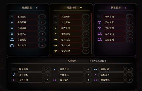 首先说一下,特质中一个经历里的白额灵蛇,一个财富里的盛世集录,这两个是除了开档选择,现版本再也无法在这个存档的游戏内过得了。