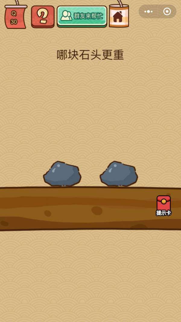 微信脑力大乱斗X第30关的过关题目为:哪个石块更重。图上有两个石块,想要知道哪个石块更重,我们应该如何操作呢?快来看看过关攻略吧!