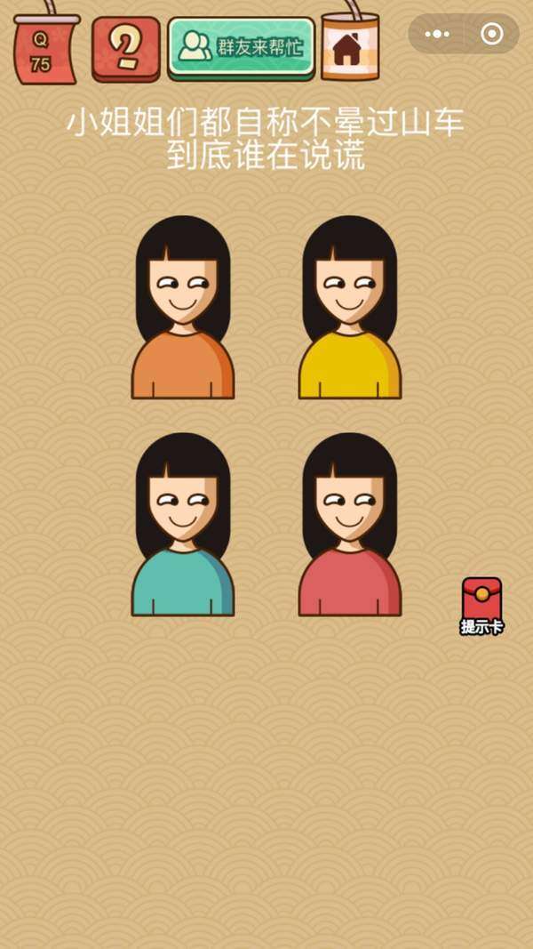 脑力大乱斗X第75关中,有四个长相一样,但是颜色不同的小姐姐,这四位小姐姐们都自称不晕过山车,到底谁在说谎?一起来看看这一关的过关攻略吧!