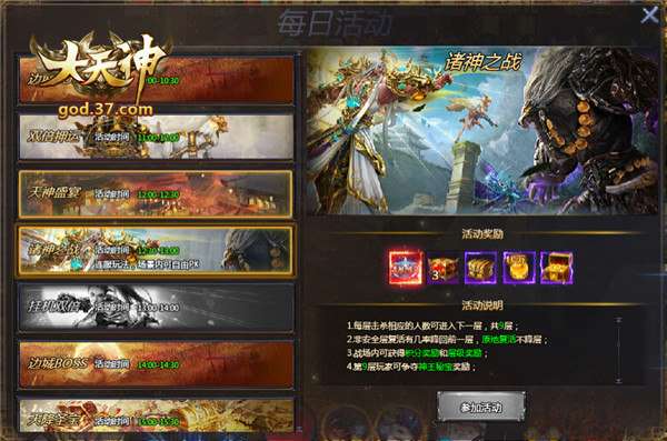 在37《大天神》中,当玩家在诸神之战系统的每一层击杀相应人数后,即可进入下一层,该玩法共分为9层,击碎神秘守卫也会增加击杀人数,其中,安全层为1-5层,死亡复活不降层,而在非安全层死亡则有几率降回一层,原地复活不降层。