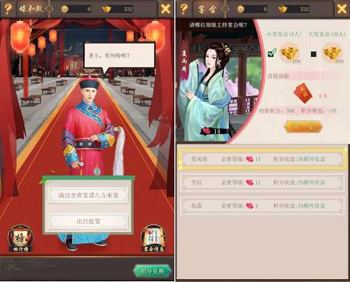 在举办宴会时,主持宴会的妃子可以增加宴会的收益。不同妃子的增益能力不同,一般来说,妃子与君主的亲密度越高,增益的幅度就越大。