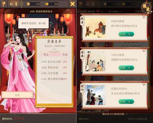 在赴宴时,妃子可以参与宴会上的小游戏。每次赴宴有两次游戏的机会,妃子可以在投壶、猜拳及射灯三个游戏中任选两个体验,如果妃子表现出色的话,也有机会得到珍贵的宴会积分。每天,后宫中的每位妃子只能举办宴会一次和赴宴一次,当宫中的妃子都完成了宴会的任务后,就不能再参与宴会。