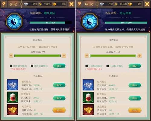提升运势的方法主要有两种,一种是赈灾,还有一种是转运。赈灾可以将君主的运势提升至顺风顺水的程度,但这并不是运势的最高层次,只有转运才能将君主运势提升至极致,达到鸿运高照的程度。而当运势被提升至鸿运高照时,美人事件的出现概率将升至百分之百,这时无论是定向出巡还是随机寻访都必定会遇到美人。如果要增加新的妃子或良人的话,最好先将运势提升至最高再进行微服私访,这样成功的概率会大大增加。