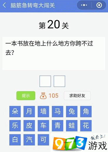 微信脑筋急转弯大闯关小游戏最近很火,好多小伙伴都在玩,游戏中的第20关是的问题是:一本书放在地上什么地方你跨不过去?有些朋友不知道怎么过关,下面iefans手游网小编就给大家带来通关攻略,感兴趣的小伙伴一起来看看吧。