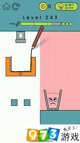 以上就是快乐玻璃杯第243关的过关攻略。快乐玻璃杯是一款简约的解谜类游戏,游戏操作和背景音乐都很符合游戏的简约元素,游戏操作方式就是划线,玩家在划线的时候,手指处在屏幕上就会出现一支铅笔,而所画的线也就像是铅笔所画出的一般,这里就是小编前文所说的游戏操作与场景很相配的原因。就像在学生时代上课无聊在本子上乱涂乱画一般,场景中所有的物品都仿佛是乱涂乱画出的一般,不管是玻璃杯还是出水的水管,甚至是流动的水,都有一宗简笔画一样的手绘风格获得更多最新资讯 攻略 请持续关注iefans游戏专区。