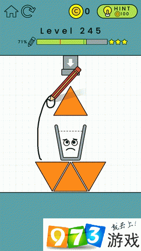 以上就是快乐玻璃杯第245关的过关攻略。快乐玻璃杯是一款简约的解谜类游戏,游戏操作和背景音乐都很符合游戏的简约元素,游戏操作方式就是划线,玩家在划线的时候,手指处在屏幕上就会出现一支铅笔,而所画的线也就像是铅笔所画出的一般,这里就是小编前文所说的游戏操作与场景很相配的原因。就像在学生时代上课无聊在本子上乱涂乱画一般,场景中所有的物品都仿佛是乱涂乱画出的一般,不管是玻璃杯还是出水的水管,甚至是流动的水,都有一宗简笔画一样的手绘风格获得更多最新资讯 攻略 请持续关注iefans游戏专区。