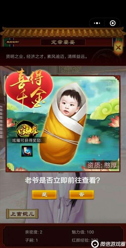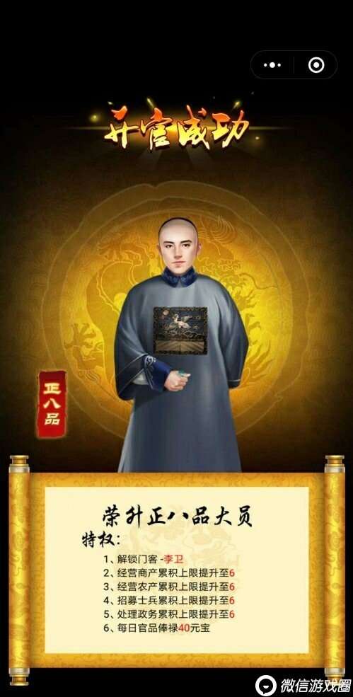 《小宝当皇上》是一款微信小游戏,无需下载,打开微信就可以玩。玩家扮演的角色会从草根发迹,披荆斩棘,历经各种磨难,一路升官,直至入主皇城。