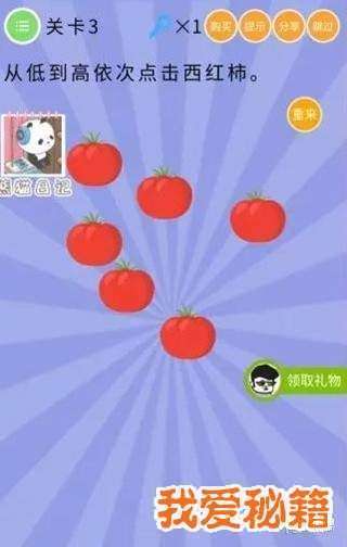 正确答案:从下面依次点击西红柿,最后点击题目中的西红柿~