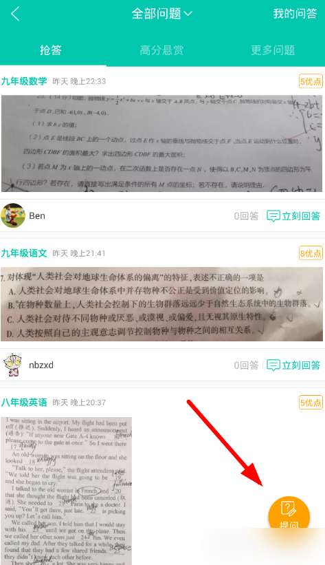 2、紧接着在问答页面的右下角找到提问选项,这样就能够尝试给卷子上的难题进行拍照上传,从而发起提问了。