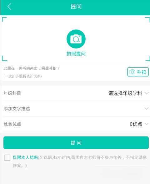 3、将难题拍摄上传之后,还需要设置与问题相对应年纪科目,添加文字描述,并且提供优点悬赏,点击下方的提问按钮即可完成发布。