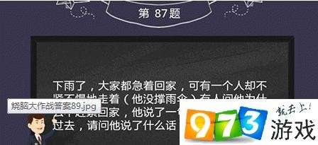 烧脑大作战第87关答案是什么?下雨了,大家都急着回家,可有一个人却不紧不慢地走着,(他没有撑雨伞)有人问他为什么不赶紧回家,他说了一句,使那人晕倒了过去,请问他说了什么话?小编在这里为大家分享了烧脑大作战第关的过87关攻略,一起来看看吧。