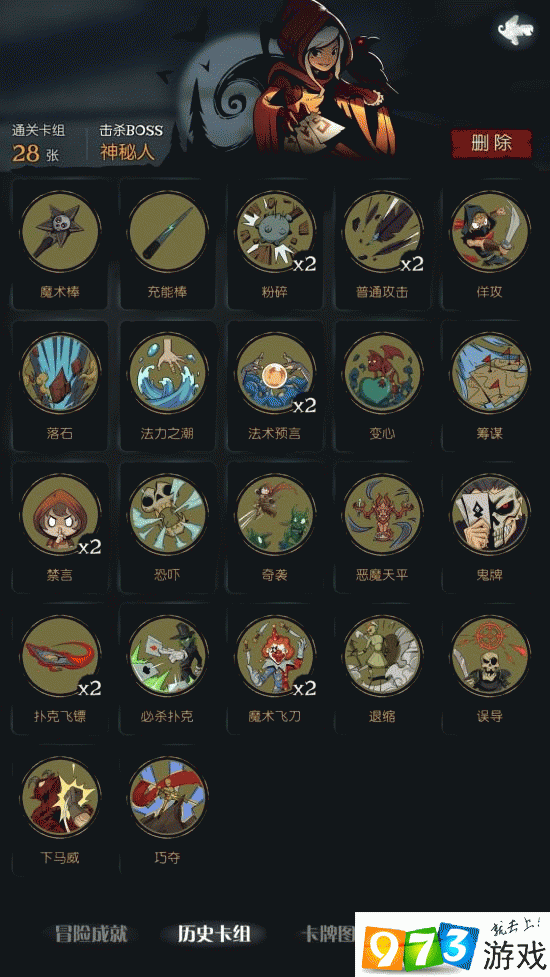 可以留起手送的扑克飞镖刷充能棒,卡基本齐后遇见boss一般起手如果没诡计,魔术力场如果废卡拿的不多基本起手几张反制,用1技能拿魔术力场刷卡,把反制全上,然后每回合刷上打掉的反制,用木偶戏法补克制反制卡。