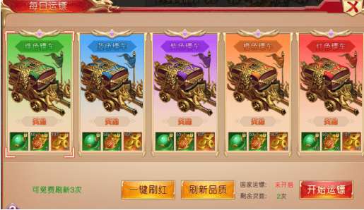 2、镖车品质分为:红橙紫蓝绿,每日将军可免费刷新3次镖车品质,超过3次则需要消耗运镖令进行刷新,当镖车为红色最高品质时,将无法再通过刷新提升,品质越高奖励越高;