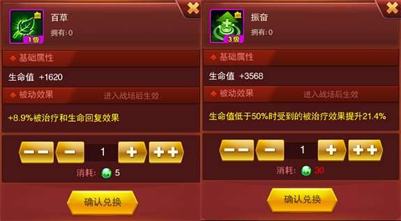 百草魔纹和振奋魔纹的基础生命值属性保证了前排英雄的坦度,百草魔纹的被治疗和生命回复效果提升搭配振奋魔纹在低于生命50%下被治疗效果提升,会使承伤型前排英雄拥有极高的回复能力,承受更为大量的伤害。