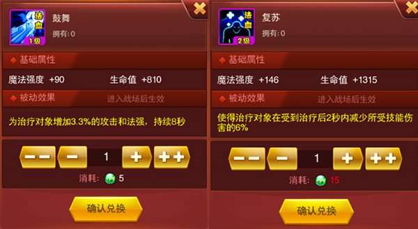 鼓舞魔纹和复苏魔纹都拥有提高法术强度和生命值的基础属性加成,鼓舞魔纹的为治疗对象增加攻击和法强效果,搭配复苏魔纹使治疗对象在治疗后减少所受技能伤害,能够使得被治疗英雄在短时间内造成伤害能力和承伤能力大大提高,保证了队伍的输出和生存平衡。