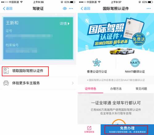 3、接下来我们会在驾驶证下方看到有一个【领取国际驾驶认证件】一栏,点击进入,点击所在页面下方的【免费办理】即可,如图所示。