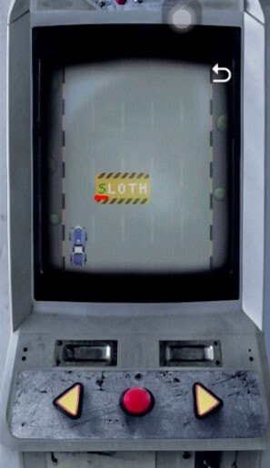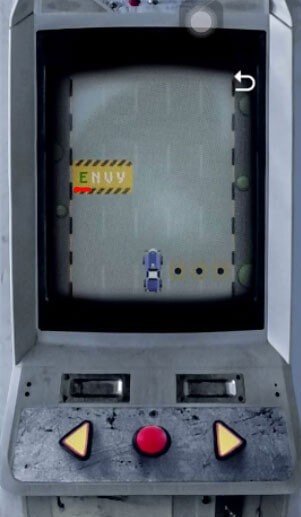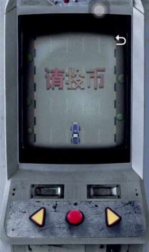 5、找到一台玩赛车游戏的游戏机,左右操控汽车避开障碍物,途中的障碍物上有用绿色表明的字母,我们按出现的顺序记下来。