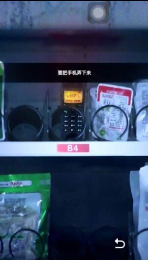 11、输入之后开启饮料机,我们需要再输入两个密码才能拿到手机。先将卡住手机的零食拿出来。