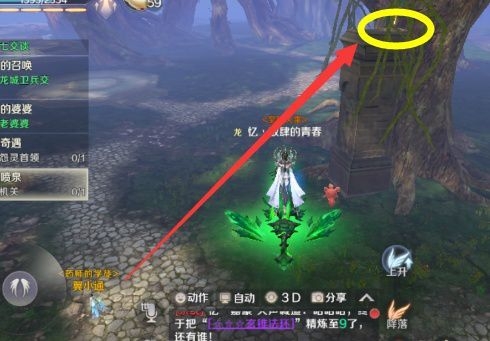 4.我们飞上这个柱子上面去以后就会很显而易见的看到一个女神喷泉的名字了,十分明显,这个时候我们只需要完成一个对话内容,然后完成剧情,完成剧情以后退出就可以了,这样就算是完成了一个女生喷泉的触发了。