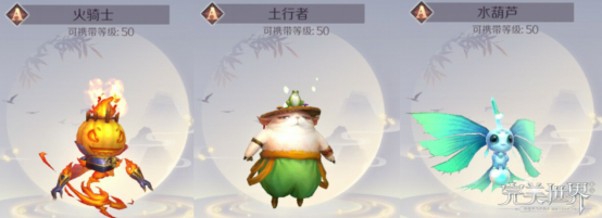治疗辅助型精灵【水葫芦】法术攻击型精灵【火焰骑士】物理攻击型精灵【土行孙】