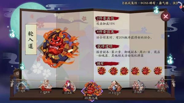 轮入道4件套在回合结束后,有一定概率获得性的回合,玩家可以利用这个效果,加快CD节奏,从而可以加快式神复活的间隔时间,也是一个比较另类的玩法。