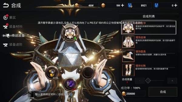 然后就死合成,因为如果副本里面是在是开不出什么好东西的话,那么就只能看合成的,使用三个低阶的装备再去进行一个合成,而且主装备的卓越属性是不会直接继承的,还可以使用传说碎片去进行合成传说的装备,因为这个样子是会增加战斗力的。