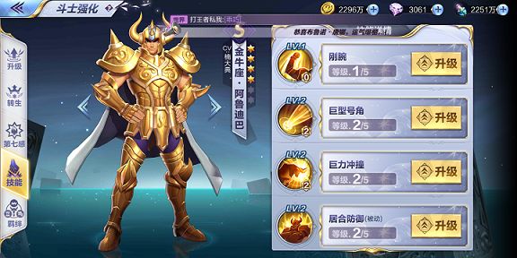 金牛座属于坦克斗士,金牛座蓄力高额的爆发也十分危险。巨型号角的攻击百分比是非常高的,但是由于物攻品阶低,所以在技能加点上可以不必加满巨型号角,而是要注重号角完后的巨力冲撞补刀效果。
