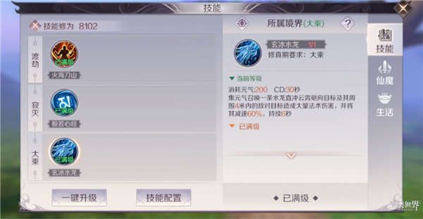 当我们达到渡劫、寂灭、大乘境界时,自身的输出能力很足了,三个境界各分别获得一个堪称必杀技的技能。火海刀山技能够消耗自身积攒的所有元气,对目标和其附近的敌人造成五段巨额伤害,能极大地提高我们的输出能力。