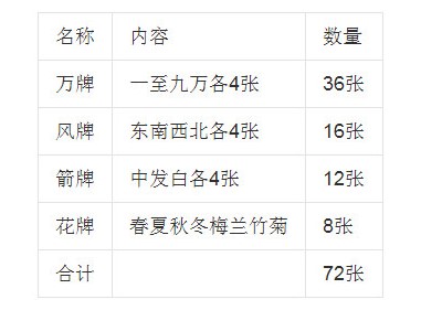 字牌:指风牌和箭牌,风牌为东、南、西、北。箭牌为中、发、白。