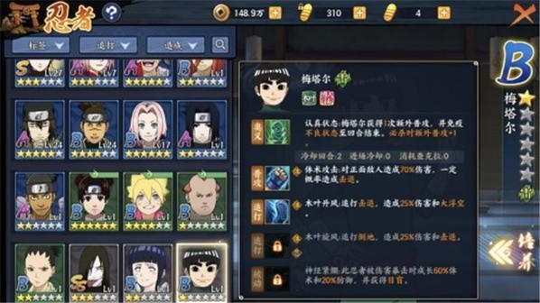 梅塔尔的奥义类似雷主的雷凯,可以免疫也可以解除自身的不良状态,CD较短,进场冷却0,是一个较为实用的奥义技能。普攻和追打很普通,没有什么亮点,追打击退和追打倒地,可以让他衔接很多忍者。在搭配上面比较方便。被动技能养成速度极快。这个被动技能最佳运用的场合是打副本和忍者考试的纲手,纲手暴击非常高,又是连续行动,很容易在有纲手的忍考或副本关卡养出强力的梅塔尔。