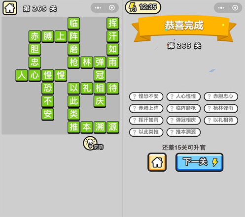 以上就是由iefans小编为大家带来的成语升官记第265关答案介绍。希望能帮助到大家,祝大家游戏愉快!