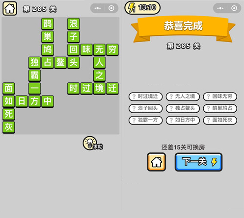 以上就是由iefans小编为大家带来的成语升官记第285关答案介绍。希望能帮助到大家,祝大家游戏愉快!