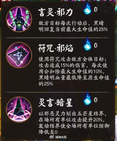 黑晴明开局自动施放技能【灵言·暗星】为敌方以及我方单位增加20%攻击力,防御降低为0。
