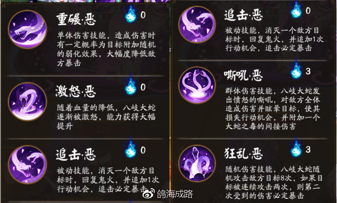 嘶吼:3火主动技能,造成AOE伤害,附加大蛇之毒的间接伤害debuff,并有概率眩晕一回合。
