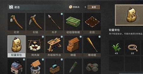工具用途:角色默认可拿10种物品,若背上背包可以额外携带五件物品,增加携带资源的能力,背包一般都是出门必备的装备。