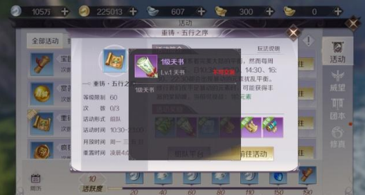 限时任务重铸五行之序有些类似某款游戏点星任务,玩家等级上限为60级以上的玩家可以参与此活动,可以完成三次奖励任务,玩家必须组队三人以上,由队长当前的可挑战等阶参与游戏,队员可以无视阶级要求,此活动只在每周一、三、五及周日开启!