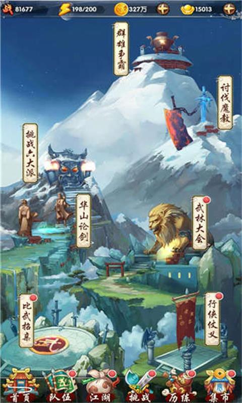 华山论剑--挑战极限,攀上武林之巅:在江湖的道路上闭门造车,只会让自己成为一只井底之蛙,想要领略众生之巅的风景,必然需要不断与强者战斗,最终立于不败巅峰。华山论剑就是玩家审视自身实力的最佳平台。华山论剑分为六个阶段,玩家每战胜一个与自身实力相仿的对手,就会取而代之,占据对手所排位置。当玩家到达一定等级,就可以飞升至下一层,以挑战更多强者。在这里一切以实力说话,只要你足够强大,立于众生巅峰,就可获得海量积分与元宝。