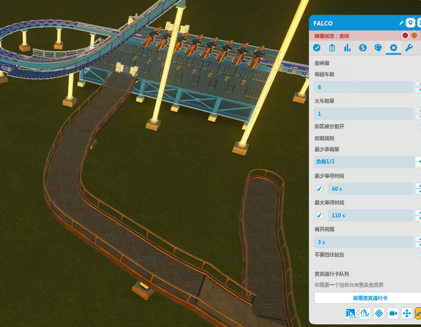 出入口:按照设施建设步骤来。先设置入口,靠近上车的地方。再设置出口,靠近下车的地方。用自带围栏的道路连接入口至主干道。再用普通道路连接出口至主干道。 快速通道:先在设施入口通道尽头附近开个快速通道出口,再在入口通道的末端开个快速通道入口,连接它。 出入口是有方向的,造的时候可以调节。