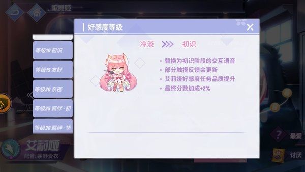 音乐之心是一个比较重要的加分点,音乐之心的提升是对舞蹈最终得分的加成,目前最高级的音乐之心可以提供10%的舞蹈分加成,音乐之心的提升主要由左下角的猫(明明就是狐狸!)发布的成长以及日常任务来提升,另外,歌舞姬的每日和部分送礼得到的任务也会提供音乐之心的经验。