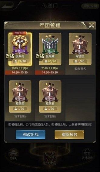 联盟里面是可以创建军团的,也是已军团为单位的,玩家可以指派20个玩家进行参加,当然人数是不能超多6个军团的,只能是创建6个军团。玩家可以管理军团,让一些玩家报名,让一些玩家出战,不同段位的玩家匹配到的对手也是不一样的。
