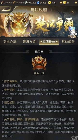 想要提升就可以去参加楚汉争霸的军团排位玩法,可以和别人进行对战,和别的联盟进行单挑的PK,所以才有的排位赛。三个月的排位赛,而且还有晋级和降级玩法,每颗星都是关键,可以由军团长进行安排人数,然后在跨服战里一直打。