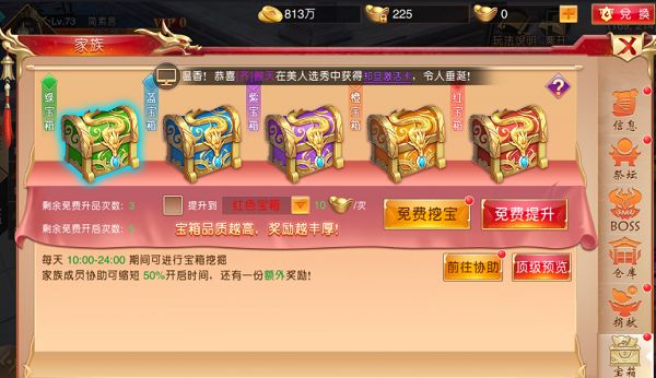 进入家族很大一部分原因就是为了获得家族福利,所以进入家族后我们可以看到家族福利界面的众多福利内容,包括家族签到奖励,完成帮会任务后获得的家族工资,家族成员捐献家族后领取宝箱的家族金库,活跃家族的家族管理员可以在管理分红中获得金币分红,当然也少不了家族新成员加入时自动发送的迎接萌新的迎新词。