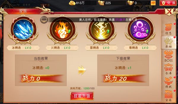 当玩家达到一定等级后就可以创建或者加入家族了,点击游戏界面左下角的家族按钮可以进入家族界面,首先看到的就是家族信息。家族信息界面左侧是家族的名称、等级、声望、资金以及成员和贡献度等信息,中间是家族成员的一些动态,右侧则是家族玩法的一些子系统。