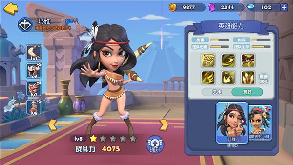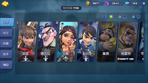 首先要介绍英雄选择界面,共有亚瑟、德古拉、玛雅、赵云、格雷特等十多位能力各异的英雄,英雄解锁后,所有关卡、竞技、娱乐模式中均可使用。