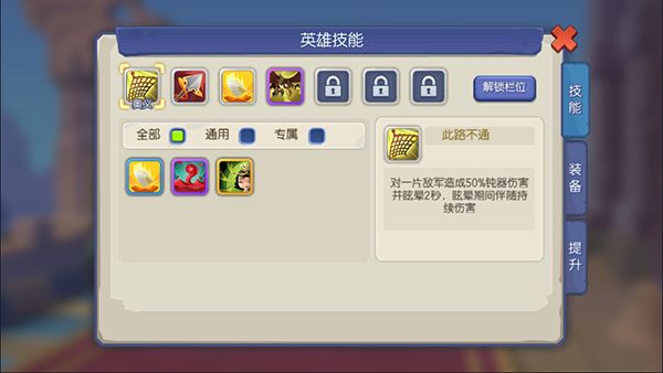 “关卡技能”用于竞技模式,通过学习技能书获得技能。使用多余的技能书、技能书碎片可以开启更多技能槽位。通过收集技能书碎片,达到数量后可以自动合成对应的技能书。另外,英雄的装备有专属武器、头盔、铠甲、靴子4类,强化装备可以大幅提升战斗力,穿戴套装有额外属性加成。