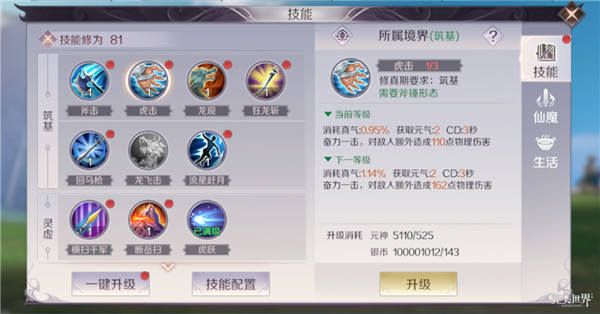 筑基期智能用斧,虎击的强化普攻还是很有用的,虎击打完接3下普攻再接虎击无脑输出就行;狂龙是前期清怪的技能,小型AOE还有概率眩晕敌人,但是最多只能打中6个目标哦。