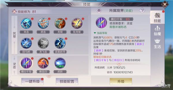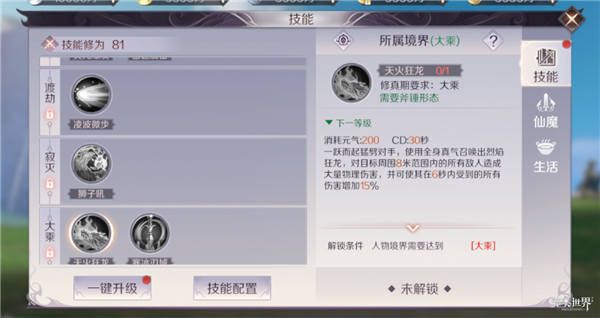 渡劫和寂灭期的技能凌波微步可以提高移速免控,狮子吼可以打出眩晕控制,而大乘境界的斧-天火狂龙可以打出巨额伤害,枪-寒冰刃域则有着不俗的控制效果。