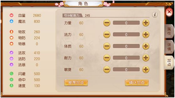 角色加点:按角色特色把潜力点数分配给力量、法力、体质、耐力和敏捷,玩家可点击推荐加点来获得系统的加点提示,每次加点都能提升战力。